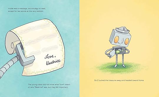 The meaning of this book is clear, and it is a message kids can never ever get enough of. It makes them consider what they might tell Z if the cute robot stopped and asked them to define love. The various answer make it clear how wonderful and the various ways in which love in shown. Throw in a cute little adventure as Z sails down the small stream to places the robot's never been before...and the slight tension which builds by the end when it doesn't appear the goal will be found...and it's an exciting read, which holds the attention until the last page. In other words, this book has everything a good story needs.