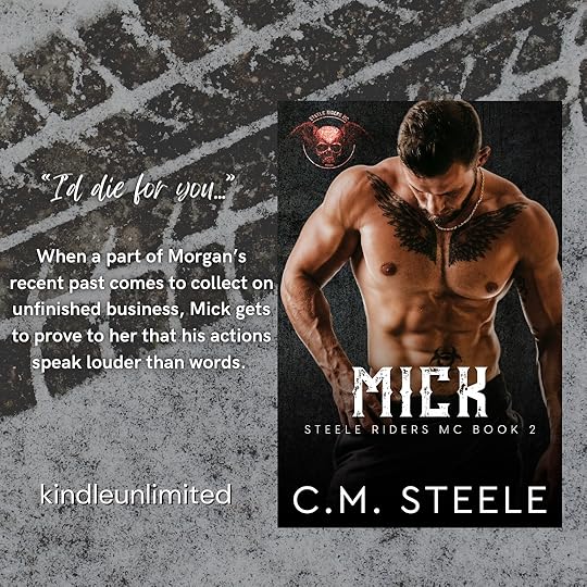 Mick is the second book in the Steele Riders Series by C.M. Steele...Mick and Morgan have been in love with each other for a couple of years, but neither have done anything about it. Mick knows Morgan is young and wants her to experience things....and he wants to be able to provide for his princess....oh and one big thing stands in the way of his happiness...in the form of Boomer...Morgan's older brother and Mick's president...I loved this book...I dont fo spoilers so you'll just have to read the book, but you're sure to love it! These two are hot!