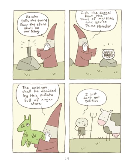 I am more than happy that I finally decided to read this, it was absolutely brilliant. We have some recurring themes (like the king, the pages in between the comics (though I lost track of how that one went), the creation story, unicorns, death), but there are also a ton that only pop by once (or maybe I was too teary-eyed from laughing). All the comics are hilarious.