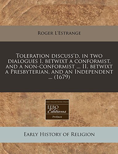 Toleration discuss'd, in two dialogues I. betwixt a conformist, and a non-conformist ... II. betwixt a Presbyterian, and an Independent ... L'Estrange, Roger, Sir, 1616-1704. Table of p. [3]-[8] Attributed to Roger L'Estrange. cf. NUC pre-1956. [8], 350 p. London : Printed by E.C. and A.C. for Henry Brome ..., 1679. Wing / L1316 English Reproduction of the original in the Union Theological Seminary (New York, N. Y.) Library