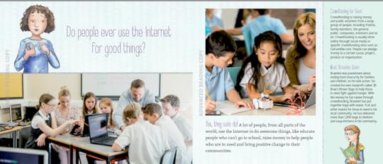 This isn't going to make an exciting read-aloud, but it has really good information in it and it's written in a way that's kid-friendly. I might start this in 3rd grade. One page is a question that a child might ask and the next page answers the question. Most pages have extra information about the topic in a box off to the side. Real photographs are used to represent the topic and drawings of children are also included to coincide with the page theme. (It took about 5 1/2 minutes to read aloud intro page and 4 of the question pages (which was 9 pgs out of 26 pgs). Topics covered: *how can internet be unsafe? (inappropriate, parental controls) *why people put inappropriate things online? *boundaries crossing them online (privacy, good judgement) *online bullying *items online aren't necessarily private and may not be able to be erased *making friends online *feeling uncomfortable online *positive internet uses (crowdfunding, Braeden Quinn) *how to us the internet beneficially (Malala Yousafzai) *Social Media Guidelines