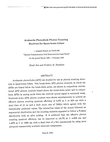 Avalanche photodiodes (APD) are studied for uses as photon counting detectors in spaceborne lidars. Non-breakdown APD photon counters, in which the APD's are biased below the breakdown point, are shown to outperform: (1) conventional APD photon counters biased above the breakdown point; (2) conventional APD photon counters biased above the breakdown point; and (3) APD's in analog mode when the received optical signal is extremely weak. Non-breakdown APD photon counters were shown experimentally to achieve an effective photon counting quantum efficiency of 5.0 percent at lambda = 820 nm with a dead time of 15 ns and a dark count rate of 7000/s which agreed with the theoretically predicted values. The interarrival times of the counts followed an exponential distribution and the counting statistics appeared to follow a Poisson distribution with no after pulsing. It is predicted that the effective photon counting quantum efficiency can be improved to 18.7 percent at lambda = 820 nm and 1.46 percent at lambda = 1060 nm with a dead time of a few nanoseconds by using more advanced commercially available electronic components. Sun, Xiaoli and Davidson, Frederic M. Unspecified Center...