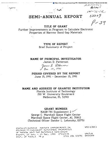Research into the properties of narrow band gap materials during the period 15 Jun. to 15 Dec. 1991 is discussed. Abstracts and bibliographies from papers presented during this period are reported. Graphs are provided. Patterson, James D. Unspecified Center NAG8-781...