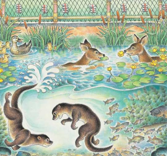 This has to be the strangest idea for a children’s book. . . maybe not so much for a kid growing up in South Korea, but still. . . Vegetation and animals can do whatever they want at the border’s no-man’s-land, but not people. A grandfather is a unifying figure in the story, as he climbs to the observatory to take in the view over and over. The reader is led to believe he’s looking at the landscape and all the animals described, but of course it’s so much more than that. Despite the small article in the back, a parent should be prepared to explain to the young reader why grandfather can’t go over there. Best part of this is the artwork, done in the beautiful style of this part of the world. 3.5 pushed up to 4/5