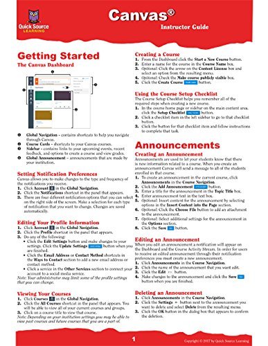 Do you need an easy-to-follow software reference right at your fingertips? Our 6 page, tri-fold guides are the answer. These quick reference guides include step by step instructions to help users to learn software more quickly, as well as full color screen graphics to highlight important features. Quick Source reference guides also include the software programs NEW features and gives you quick access to time saving shortcuts. The Canvas Instructor Edition Quick Source guide is a clear and concise tool for learning the features in Canvas. This guide includes tips and instructions on many topics, including Creating an Announcement, Viewing Your Courses, Creating an Assignment, Working with Discussions, Using SpeedGrader, Adding Users to a Course, Creating a Quiz, Adding Items to a Module, and so much more!