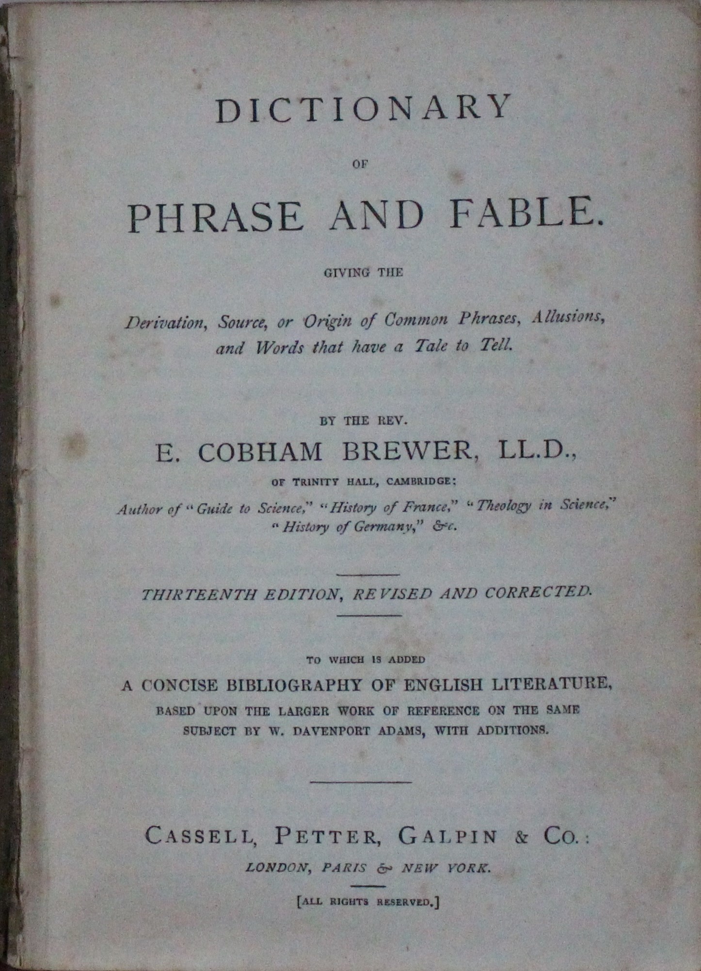 While relaxing and reading my evening repertoire of the 1 million best books, I periodically, crossed a person a place or phrase that somehow missed my reading repertoire. When this happens, I reach for my copy of "Brewer's Dictionary of Phrase and Fable."