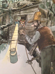 Findus in this book is so comical and little kid-like in the way he interacts throughout the story, and I love famer Pettson’s confrontation with the chickens and the humorous illustrations that add so much to the story—the chickens sitting around in the coop drinking tea with curlers in their “hair.” (Also, I love how eager the chickens are so eager to exonerate themselves from being the ones guilty of ruining the garden!)