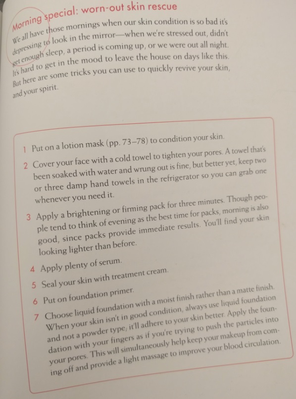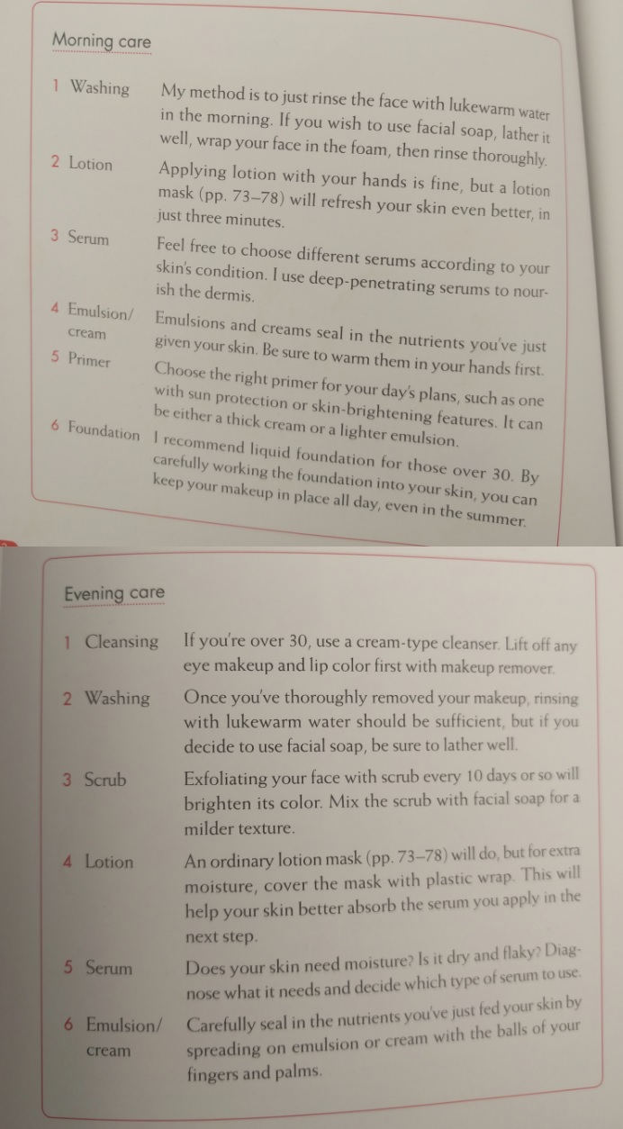 It's book though little pricey, has a few of the useful tutorials. The main idea revolving about this book is perhaps only the lotion mask method. The massages and other concepts were nothing new and not exactly a "Japanese skincare routine". However the lotion mask was indeed very useful, I invested a lot into cotton pads after reading this book and noted the improvement in my skin.