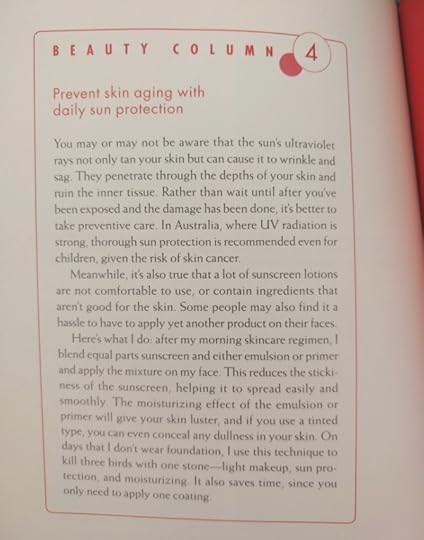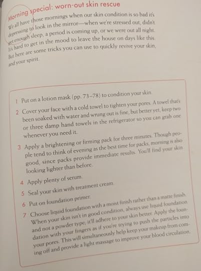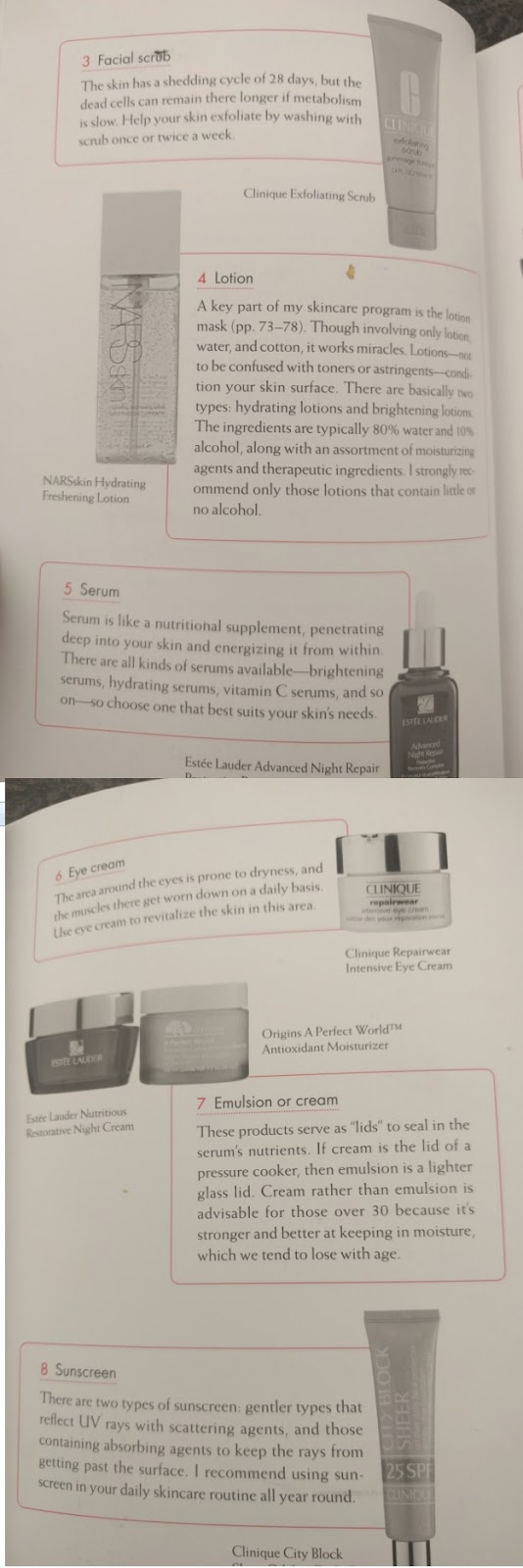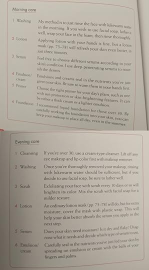I like how this book goes through skincare for different skin types (combo, oily, dry, normal). The facial massages were helpful, although a bit hard to follow while holding the book open. I'd suggest watching her YouTube videos instead. Some of the products she recommends still have questionable chemicals though, so I'd do your research before rushing out to buy all of them. She does provide actionable steps though (only four steps) for morning and night routine. If you search online, you'll find some Asian skincare routines are up to six or seven steps, not including extras like exfoliation and masks. One thing is she doesn't mention double cleansing if you wear makeup or sunscreen, which I think is one of the keys to clear skin. In any case, this book is still a "revolution" compared to the Western ways of skincare, so read if you haven't heard of the wonders of facial sheet masks (I hear these are now sold at Target).