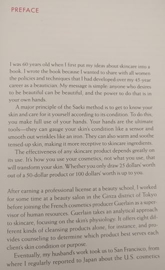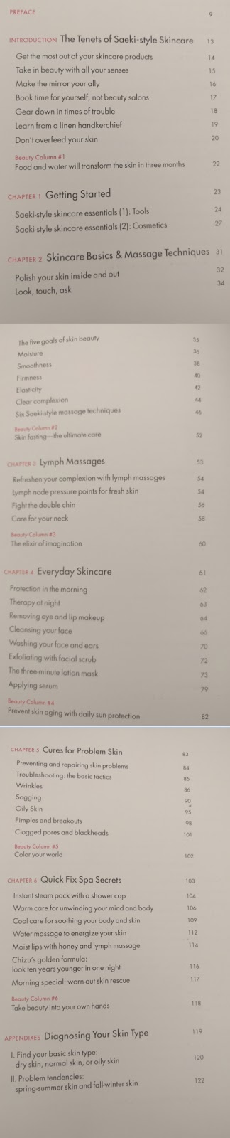 Chizu Saeki has such an easy way of explaining and writing - it's almost like an instruction book written in poetry! Her skin-care techniques are ones she's been using herself for decades either on her own skin or in her salons. She focuses on giving your epidermis and dermis moisture and attention without using expensive products, and the massages feel lovely and help drain lymph nodes of toxins. I've only tried a few techniques and can already feel my skin saying 'thank you'!