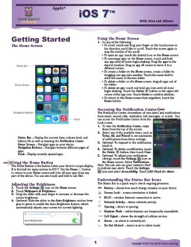 Do you need an easy-to-follow software reference right at your fingertips? Our 6 page, tri-fold guides are the answer. These quick reference guides include step by step instructions to help users to learn the software more quickly, as well as full color screen graphics to highlight important features. Quick Source reference guides also include the NEW features and give you quick access to time saving shortcuts. The iOS 7 Quick Source guide is a clear and concise tool for learning the features in Apple s iOS 7. Features contained in this guide include features such Accessing the Notification Center, Using the Home Button, Sharing Content with AirDrop, Dictating Voice to Text, Changing Siri s Voice Gender, Using Gestures to Multitask, Using the Control Center, and much, much more! If you want a Quick Source Guide, but do not see the title you want, visit us at quicksourcelearning.com.