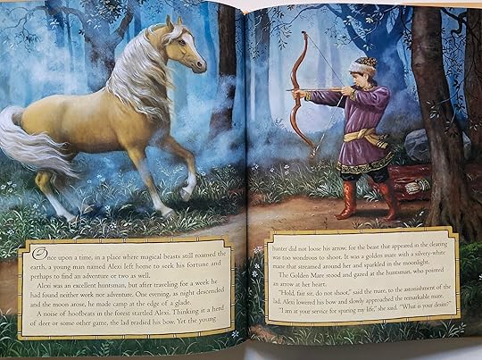 Ruth Sanderson (one of my favorite equine artists) blends a few Russian folk tales into this fantasy of a poor young Russian who accidentally nearly kills a golden colored mare -- and the fun begins. Russian folk tales are practically the same in flavor as European folk tales, so this does have a predictable ending.