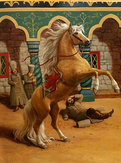 A retelling of a classic fairy tale, if less known nowadays, with a few tweaks. Alexi acquires a magical golden horse who gives him good advice, but the tsar resents the only Alexi can ride her. When Alexi finds a firebird's feather and gives the tsar it, the tsar starts with demanding the firebird itself.
