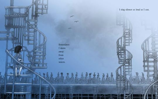 The text is beautifully written, poetic, evocative. The illustrations, however, are not my cup of tea and are rather creepy. Granted, the art does well at depicting sameness, the factory of education and the pressure of peers who all have the same masks (as does the main character) to put on when needing to be one, to fit in. Nonetheless, it's dark and even when the girl reaches beyond, recognizes she has a voice and will be heard, the artwork feels oppressive.