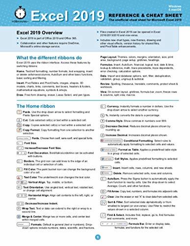 Updated Excel for Microsoft 365 Cheat Sheet available - search Amazon for ISBN 1641880570 or 9781641880572 . Do you need a quick reference for Microsoft Excel 2019? The four-panel Excel 2019 Reference & Cheat Sheet contains tips and examples of basic Excel functions and features for both Excel 2019 for Windows and Excel 2019 for macOS . Most instructions and examples also apply to Excel 2016 and earlier versions of the software. Topics Note that the Excel 2019 Reference and Cheat Sheet does not cover advanced features of Excel 2019, the Excel mobile apps for tablets and phones, or other Microsoft Office/Office 365 applications. The four-panel reference is printed on 8.5 by 11 inch high-quality card stock, perfect for desks, walls, and shelves. It has holes for three-ring binders. Fully recyclable and designed for readability. The Excel 2019 Reference and Cheat Sheet was created by the publisher of the award-winning IN 30 MINUTES guides and is based on Excel Basics In 30 Minutes . The Excel 2019 Reference and Cheat Sheet is an independent publication and is not affiliated with, nor has it been authorized, sponsored, or otherwise approved by Microsoft Corporation.