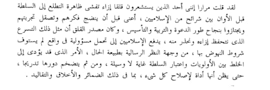 الكتاب ممتاز يتناول أكثر من قضية تم طرحها بعد الثورة وبداية ظهور الإسلاميين وأفكارهم للنور سواء في مصر أو غيرها يجيب الكتاب علي العديد من الأسئلة والأفكار المغلوطة المنتشرة حتي الآن لدي البعض من أن التعددية والأحزاب هي شرٌ محض، أو أن الديموقراطية كفر ومناقضة للإسلام، أو أن الدستور هو كتاب يقصد به المخالفة للقرآن وغيرها مما يرد عليه هويدي منذ تسعة عشر سنة وإن كان ذلك في سياق التجارب المعاصرة في حينها (الجزائرية أو غيرها) إلا أنها بوجه عام لا تزال صالحة حتي ننتهي من تلك المعارك الوهمية ونلتفت للقضايا ذات الأولوية