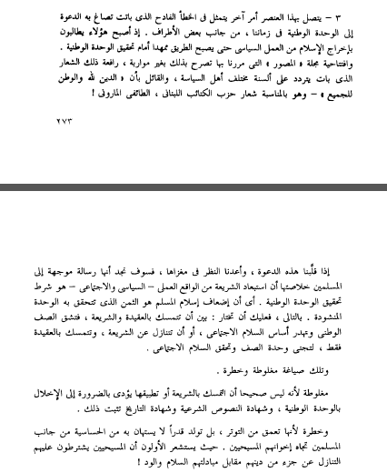 ويرد على من يقولون بفصل الدين عن الدولة بالقول ان الدين لله والوطن للجميع الذي هو شعار لحزب طائفى في لبنان وخاصة من يقولون ان تدخل الدين الاسلامى بالسياسة كفيل بتدمير الوحدة الوطنية فيقول