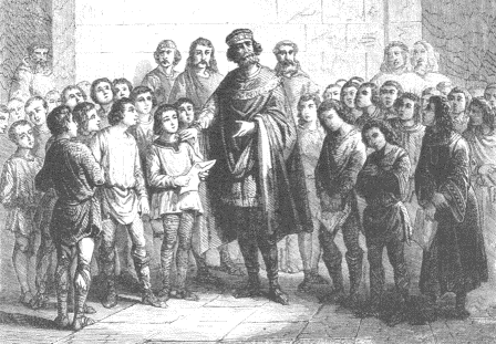 He was an ardent admirer of the liberal arts, and greatly revered their professors, whom he promoted to high honors. In order to learn grammar, he attended the lectures of the aged Peter of Pisa, a deacon; and for other branches he chose as his preceptor Albinus, otherwise called Alcuin, also a deacon, - a Saxon by race, from Britain, the most learned man of the day, with whom the king spent much time in leaving rhetoric and logic, and more especially astronomy. He learned the art of determining the dates upon which the movable festivals of the Church fall, and with deep thought and skill most carefully calculated the courses of the planets. Charles also tried to learn to write, and used to keep his tablets and writing book under the pillow of his couch, that when he had leisure he might practice his hand in forming letters; but he made little progress in this task, too long deferred and begun too late in life.