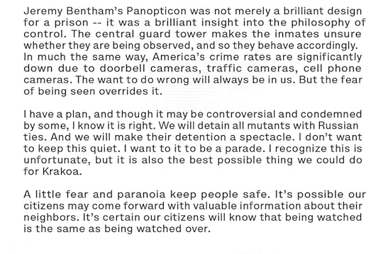 There's even some bullshit text page of Hank's rationalization using the Panopticon as an example, etc etc blah blah blah HE'S ROUNDING UP RUSSIAN MUTANTS LIKE MAGNETO DIDN'T FUCKING SURVIVE THE HOLOCAUST!!!!!