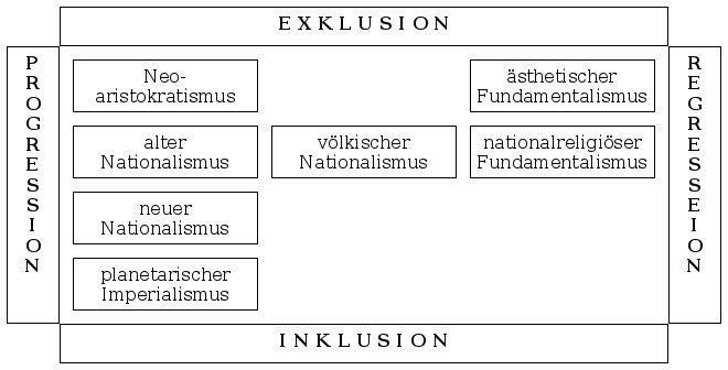 Rechte Progression im Sinne kapitalistischer Rationalität, Technik und Wissenschaft (Abwertung aller nicht-formalen Denk- & Orientierungsmuster), Weltmarkt und nur durch komplexe Organisation regulierbare Beziehungen; Inklusion im Sinne eines Einbezugs der Frauen und Arbeiter in politische Systeme, Schulen, Märkte/Berufe usw. Im Achsengegensatz zur Wiederverzauberung der Welt mit Rückkehr zu einfachen, auf Interaktion beruhenden Sozialsystemen, ökonomisch Selbstversorgung/Autarkie, politisch-rechtlich Antistruktur und Charisma, Monopolisierung bestimmter Funktionen und Rechte