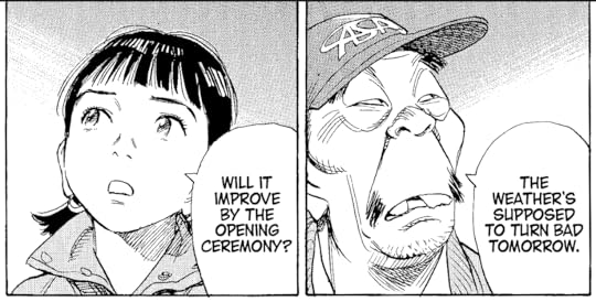 The plot may be thickening in this volume, but that seems like it's in the same way that instant pudding thickens in the fridge: because it's just sitting there. That's not to say that there aren't important pieces of the story; the reveal that Japan does, in fact, have fighter pilots fort he first time since WWII is definitely worth paying attention to, as is the fact that the government (or at least a shady piece of it) is aware of Nikaido's research materials from his mentor, which deal with the mysterious creature that surfaced during the typhoon all those years ago. Unfortunately those moments are almost lost in the story's holding pattern - the government guy is being shady and mysterious, Asa's friends are creating Drama, and the Olympics are coming. The reappearance of the kaiju towards the end of the book implies that things will be more dynamic in the next volume, which is good. Urasawa's always worth reading and I still enjoyed this, but it definitely lost a little of its power.
