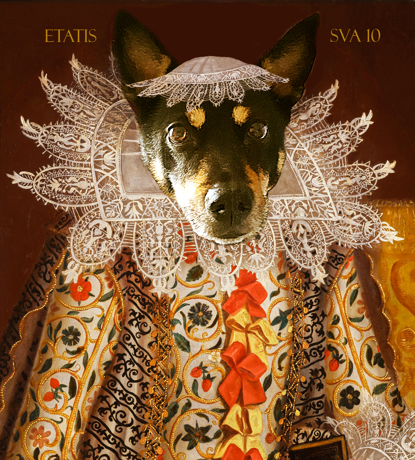 Yes. I actually did this to my own dog. It’s like she’s a time traveler against her own fur-will. I confess at having laughed way too hard whilst doing this portrait of Sascha Marie, who you can follow on Facebook by clicking on her name (which I just now typed). I’ve been spending some time honing my Photoshop skills, and in doing so, have even gotten my first commission for a pet portrait, yo! Check it out. I titled this portrait, Her Grace Callie Mae, Duchess of Purrington. Not bad, huh?