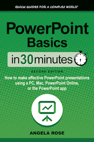 PowerPoint Basics In 30 Minutes: How to make effective PowerPoint presentations using a PC, Mac, PowerPoint Online, or the PowerPoint app by Angela Rose is really designed for the person who is somewhat computer savvy, but just does not have much experience with PowerPoint.