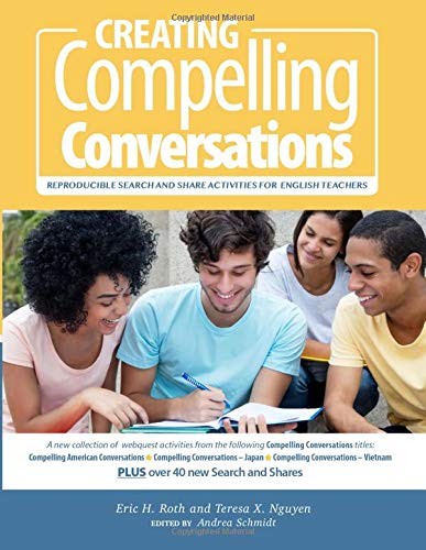 Give your English students a choice and a voice! How can we make each lesson different and engaging? How about letting our English student co-create their assignments! This new collection of reproducible 'Search and Share' activities and worksheets for English teachers gives your students a choice and a voice. Each one-page lesson encourages curiosity, deepens research skills, expands word knowledge, and sparks student discussions. How? We ask our English students to find contemporary sources, summarize information, evaluate evidence, and reflect on their relevant experiences with a conversation partner or in a small group. Students answer sets of 10 questions, cite sources, share information, learn new vocabulary, and express their opinions. The flexible worksheets and activities allow students to expand their working vocabulary in English, deepen critical thinking skills, and even learn some grammar in context of authentic documents. This collection includes the most popular 'Search and Share' activities from ESL/EFL textbook series Compelling Conversations, including Compelling American Conversations and Compelling Conversations - Vietnam. Originally created for community college and international university students, these communicative activities require students to develop essential research skills in small, focused exercises.The book also includes optional, creative and supplemental activities allowing students to create documents such as writing Yelp reviews, memos, and tourist brochures to recorded newscasts, movie reviews, and mock Skype interviews. Almost all the Search and Shares can be used as springboards for a wide range of oral presentations and/or short writing tasks. Students and English teachers have an impressive range of creative assignments based on student research. The book Studying EnglishUnit Preparing for American College LifeUnit Creating a HomeUnit Modern LivingUnit Exploring New Career OpportunitiesUnit Enjoying and Keeping MoneyUnit Traveling Around the Big WorldUnit Enjoying Free TimeThe appendix also includes student survey forms and teacher, peer, and self-evaluation forms for student presentations. Recommendations for websites and educational apps are also included. The communicative assignments also provide English students practice in citing, writing, and speaking on personal interests, academic topics, and workplace skills. Based on the extensive teaching experiences of professors Eric H. Roth and Teresa X. Nguyen with both international graduate students and community college classes, 'Creating Compelling Conversations' focuses on the essential communication skills required for academic success in American universities. Many other experienced ESL/EFL teachers and English tutors also contributed activities and ideas including Toni Aberson, Hal Bogotch, Trinity Bustria, Shiggy Ichinomiya, Yuka Kuroda, Andrea Schmidt, Tuanni B. Vasconcelos, and Brent Warner. Intermediate to advanced English students in high schools, intensive English programs (IEP), community college classes, adult education centers, and vocational programs will find these communicative activities appealing and useful. These single- page reproducible worksheets help hectic English teachers create lively classroom conversations. English teachers can also use the creative extension activities to have students give presentations, record videos, make collages, write memos, develop marketing plans, create Venn diagrams and pen persuasive essays.What will your students find and learn? How will you use these Search and Share materials? What compelling conversations will you have in your English classes?