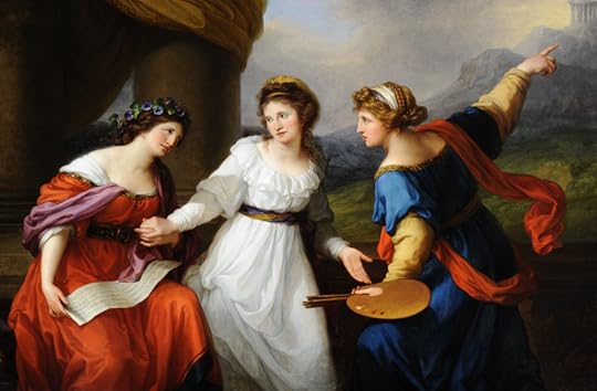 She painted several accomplished self-portraits during her years in Rome, including my favourite. Here she looks back on the choice she made as a young woman between pursuing a career in painting or in music: “Self-Portrait Hesitating Between Painting and Music” (1792) where as according to tradition, each of the Muses is personified:
