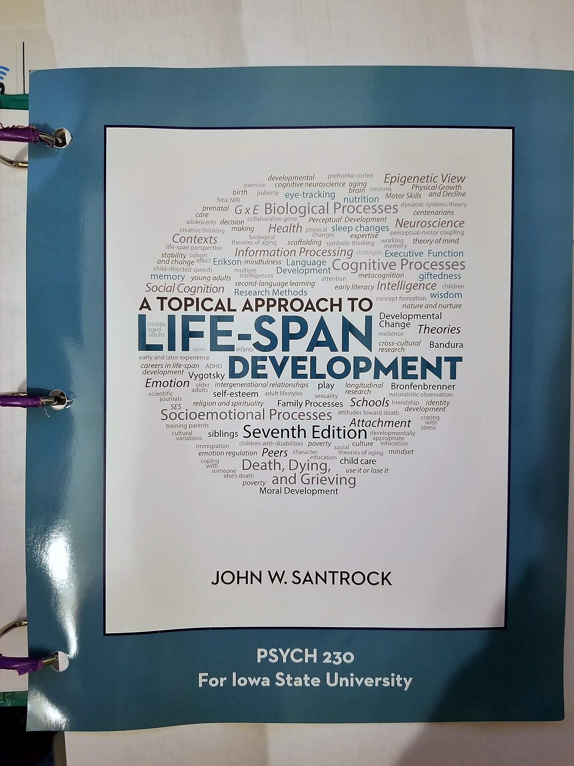 I actually had to get a custom version of this book which was esthetically unpleasing and way too expensive. A ton of wonderful information but found the set up a bit confusing. Most chapters took specific theories etc and went from early childhood to late adulthood all at once - I much prefer books that break chapters into each stage of life and look at it that way. Made doing papers about specific populations difficult as there was information in each chapter instead of certain chapters dedicated to certain developemental milestones, etc. - considering this book clocked in at 870 pages and was the size of a football field made for some major searching skills.