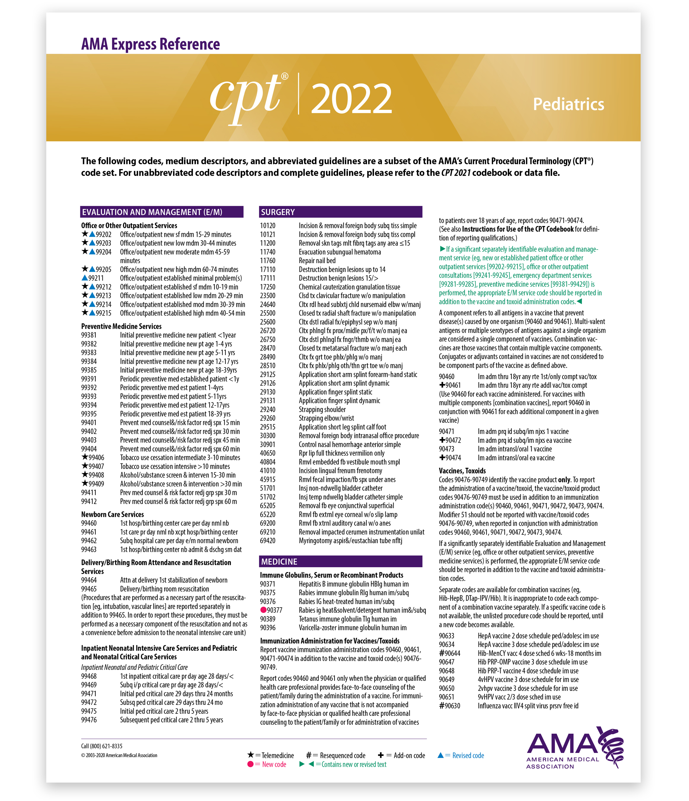 AMA EXCLUSIVE! CPT medium descriptors, symbols, and official CPT guidelines included on the cards for each specialty.