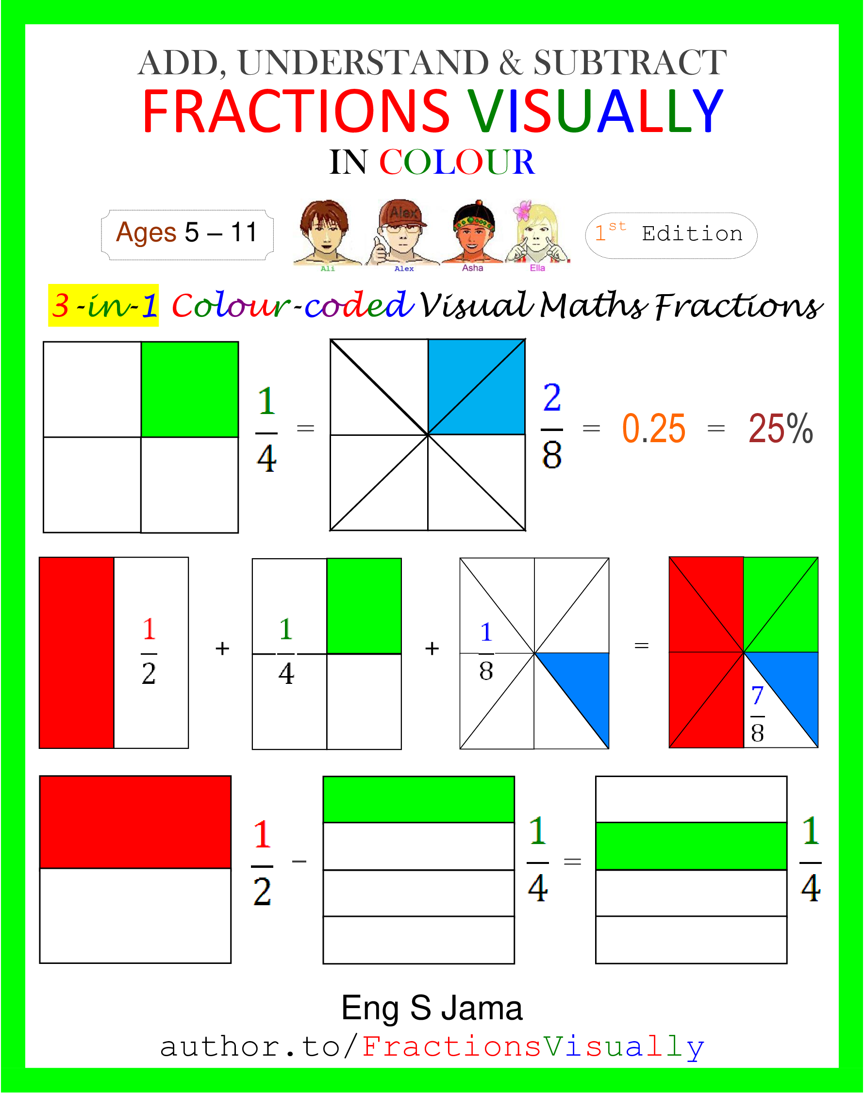 The only visual fractions book you need to UNDERSTAND, ADD & SUBTRACT fractions with same and different denominators. It is comprehensive, colourful & completely visual. 297 pages.