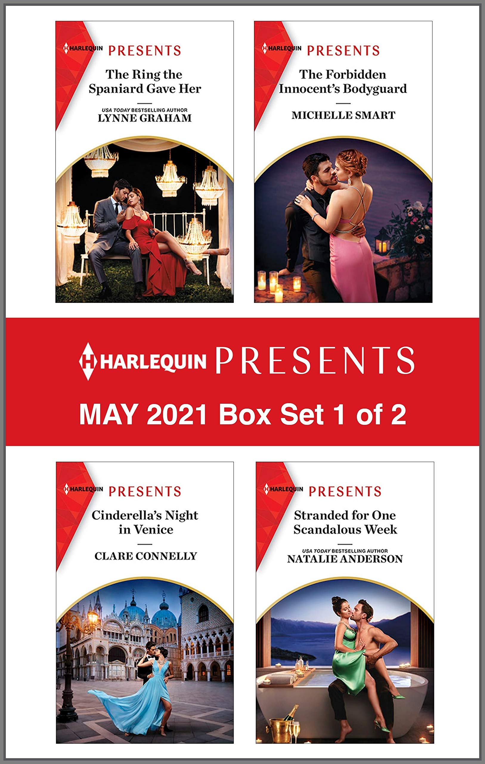 Harlequin Presents brings you four full-length stories in one collection! Experience the glamorous lives of royals and billionaires, where passion knows no bounds. Be swept into a world of luxury, wealth and exotic locations.This box set THE RING THE SPANIARD GAVE HERby USA TODAY bestselling author Lynne GrahamAccepting billionaire Ruy’s convenient proposal rescues innocent Suzy from a disastrous marriage…and creates a major their raging chemistry! He’s all icy control to her impulsive emotion. Soon returning his temporary ring feels like the biggest challenge of all…CINDERELLA’S NIGHT IN VENICE (A Signed, Sealed…Seduced novel)by Clare ConnellyWhen Ares insists shy Bea accompany him to a gala, she wants to refuse. The gorgeous Greek is as arrogant as he is charming, yet she can’t say no to her PR firm’s biggest client…or to one magical night in Venice!THE FORBIDDEN INNOCENT’S BODYGUARD (A Billion-Dollar Mediterranean Brides novel)by Michelle SmartElsa’s always been off-limits to self-made billionaire Santi. Now, as her temporary bodyguard he’ll offer her every luxury and every protection. To offer any more would be the most dangerous – yet tempting – mistake!STRANDED FOR ONE SCANDALOUS WEEK (A Rebels, Brothers, Billionaires novel)by USA TODAY bestselling author Natalie AndersonWhen playboy Ash arrives at his New Zealand island mansion, he never expected to encounter innocent Merle and their red-hot attraction. He’s back for one week to lay his past to rest. Might he find solace in Merle instead…?For more stories filled with passion and drama, look for Harlequin Presents May 2021 Box Set – 2 of 2