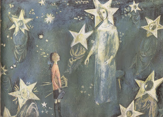 I learned how to write cursive rewriting each line of this book five times on a sheet of paper. I'm not fond of that memory as my mother was a harsh and cruel taskmistress, but I remember loving (I still do) the artwork. It had a dark and dreamy mystical quality, and the large moon and stars sitting on stools simultaneously attracted and terrified me.