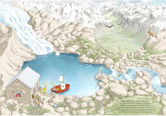 Just delightful! Bunny Rabbit has lost her favorite toy, Little Duck, and enlists the help of her brothers, Peter and Bob, to help her find it. They sail from their home by a glacial lake through many different landscapes, all the way to the sea in their search, and see many sights on the way. The reader, while following along the Rabbits' journey, are tasked with keeping an eye out not only for Little Duck, but also twelve other characters/sets of characters to see what they are up to, and to answer the questions at the beginning of the book. As with most search-and-find books, the text is light and the focus is on the illustrations, which are wonderful- so much detail to pore over, so many tiny stories going on! I saw a familiar yellow submarine in one spread.... Recommended for pretty much everyone- I'm 52 and had a great time with this book!