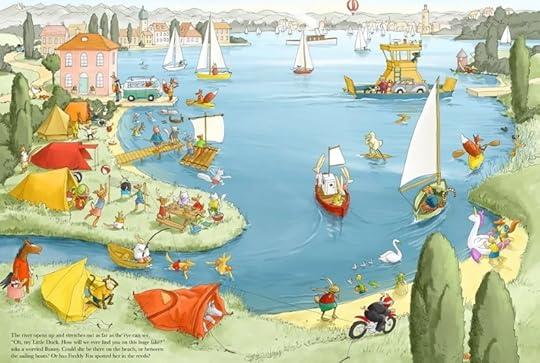This is a beautifully illustrated book about Bunny Rabbit who looses her toy duck overboard a boat and races to try to find it to no avail. Everyone she meets says they haven't seen it. Read to find out if she finds it in the end. This book has so much to see on each page that children will spend a long time observing what is happening as they read and will probably spy something new each time. I noticed the little toy duck can be seen on each page too if you look hard enough, along with afew other animals to spot - a little like where's wally.