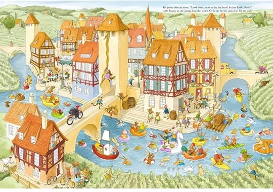Well this was a fun book to explore – just don't pick it up as a quick last read before bedtime. Each large spread has a section of story to it, for we are following some nautical rabbits from where they live, just beside some glacial meltwater (?!), and one of them has let their rubber duck float away. So we follow the duck, the rabbits and the water – and a host of other animals and situations – downstream all the way to the seashore. The minutiae really are packed in – this is not a book where you have to find a set list of things, for there is no check-list beyond the initial introduction to most of the characters. No, they're just there for you to see if you have an eye for them – the crocodiles floating on an inflatable pig, the pig floating on an inflatable crocodile, for just one. There are several allusions to fairy tale as well, with a frog prince and a Rapunzel-type situation, and despite us starting way up in the mountains the whole thing develops a distinctive Dutch flavour, to prove its country of origin. And heck, you even get a small geographical lesson and a look at the water cycle to close. A book that really does manage what it set out to achieve – and a strong four stars.