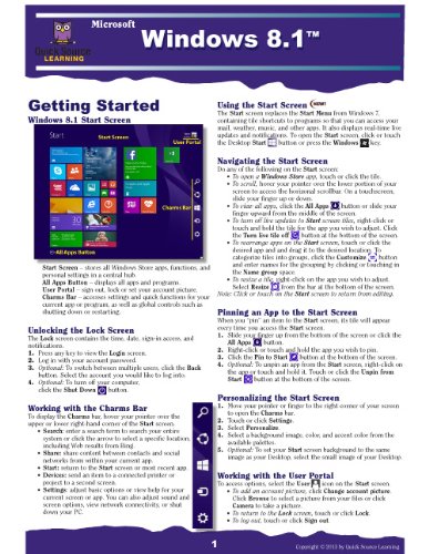 Do you need an easy-to-follow software reference right at your fingertips? Our 6 page, tri-fold guides are the answer. These quick reference guides include step by step instructions to help users to learn the software more quickly, as well as full color screen graphics to highlight important features. Quick Source reference guides also include the software programs NEW features and give you quick access to time saving shortcuts. The Windows 8.1 Quick Source guide is a clear and concise tool for learning the features in Windows 8.1. Features contained in this guide include features such Using the Start Screen, Booting to the Desktop, Navigating in File Explorer, Sending Instant Messages with the Skype App, Personalizing the Lock Screen, Adding a File to SkyDrive, Signing in with a Picture Password, and much, much more! If you want a Quick Source Guide, but do not see the title you want, visit us at quicksourceguides.com.