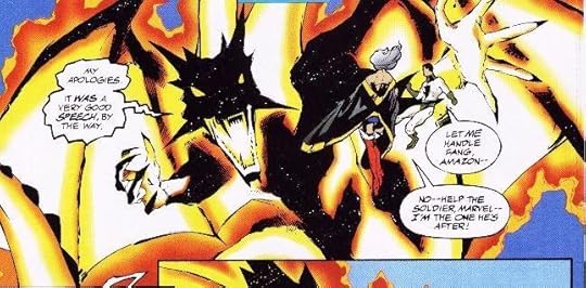 The story of JLX unleashed, like the comic of X-Patrol in the Marvel collection, seems to have forgotten or retconned some powers of its characters, like the former "Wonder Woman" suddenly being called Amazon and using a sort of electric lasso instead of her weather controlling powers or Mr. X being much weaker than before in the JLX comic. Also they should have shown us how Fin Fang Flame had overtaken all the other superhero teams und give us some more of an epic fight than what we got at the end where it works rather due to luck than anything else. Also he had a pretty cool design so why not show it? They also had the art-skills for that: And that they did not do something like this is the basic problem of that story. While the basic premise and lots of its elements would make for pretty good stories, it feels a tad cramped and the powerful dragon got down way too easily, you have to wonder why the other teams and Shield did not manage that.