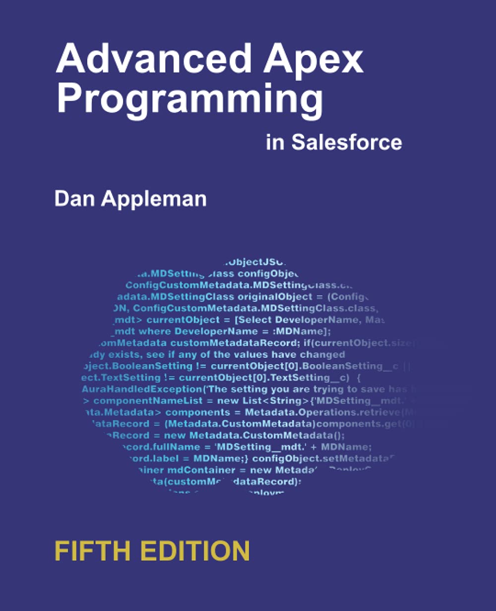Beyond the Salesforce documentation - Fifth edition Advanced Apex Programming in Salesforce is neither a tutorial nor a book for beginners. Intended for developers who are already familiar with the Apex language, and experienced Java and C# developers who are moving to Apex, this book starts where the Salesforce Apex documentation leaves off. Instead of trying to cover all of the features of the platform, Advanced Apex programming focuses entirely on the Apex language and core design patterns. You’ll learn how to truly think in Apex – to embrace limits and bulk patterns. You’ll see how to develop architectures for efficient and reliable trigger handling, and for asynchronous operations. You’ll discover that best practices differ radically depending on whether you are building software for a specific organization or for a managed package. And you’ll find approaches for incorporating testing and diagnostic code that can dramatically improve the reliability and deployment of Apex software, and reduce your lifecycle and support costs. Based on his experience as a consultant, Salesforce MVP and architect of major AppExchange packages, Dan Appleman focuses on the real-world problems and issues that are faced by Apex developers every day, along with the obscure problems and surprises that can sneak up on you if you are unprepared. This fifth edition contains updates through Winter 22 (API 53) along with significant new content including a complete rewrite of chapter 6 (Triggers)