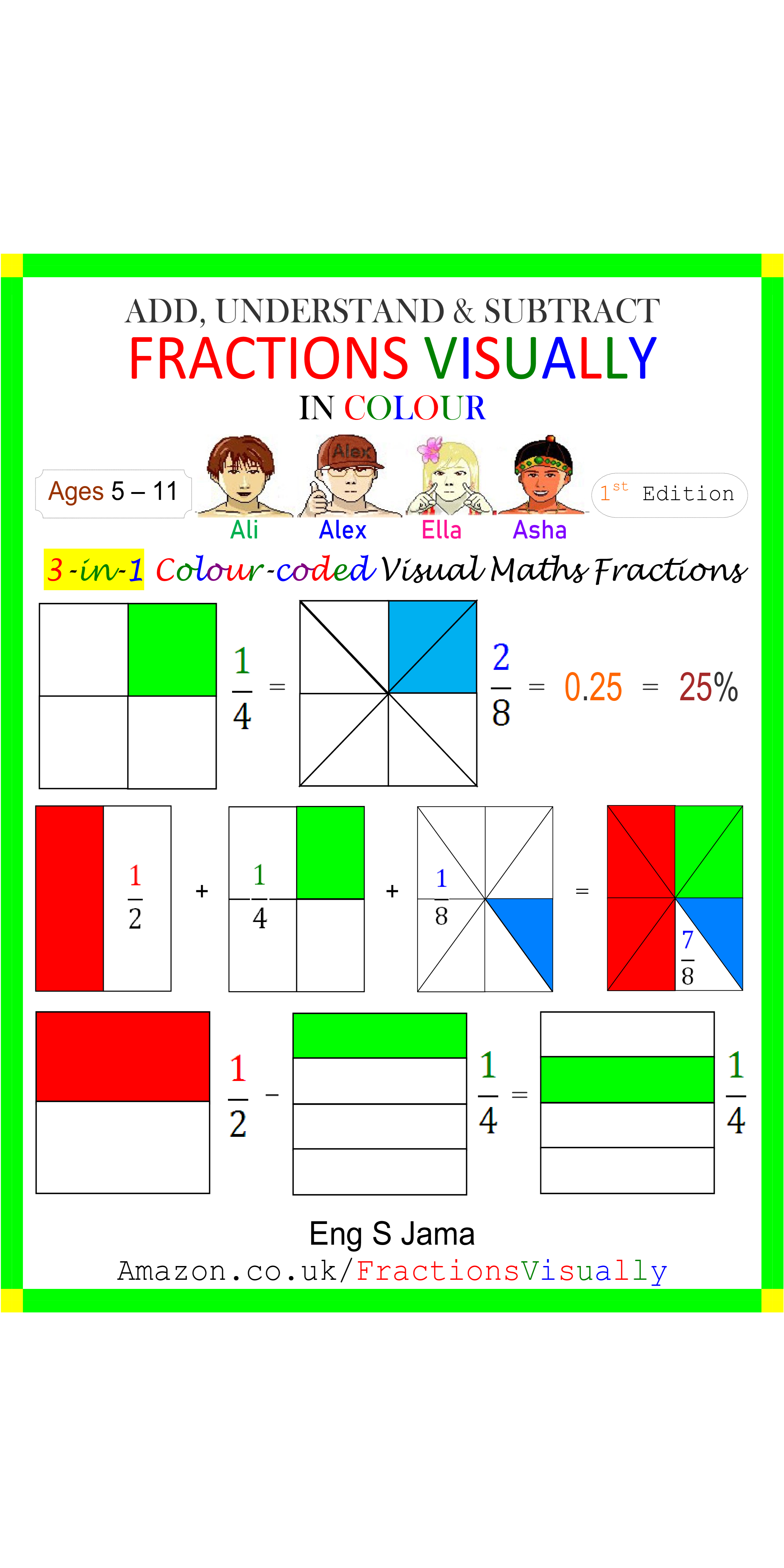 The only visual fractions book you need to UNDERSTAND, ADD & SUBTRACT fractions with same and different denominators. It is comprehensive, colourful & completely visual. 297 pages.