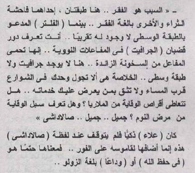 "فقط كف عن الرثاء لنفسك لأنك لم تملك العالم. كم من فتاة حسناء عرفت أنها لن تكون لك؟ كم من قصر منيف عرفت أنك لن تطأه بقدمك أبدا ً؟ كم من سيارة فاخرة فارهة رأيتها وعرفت أنك لن تملك ثمن إطار واحد منها؟ الأمر لا يختلف يا صاحبي. مجرد فقرة جديدة تضاف لقائمة الحرمان التي يخفيها كل منا في صدره، لهذا نحلم بالجنة، لهذا الجنة ثمينة جدا ً، عسيرة جدًا" عدد ناضج يظهر فيه الضعف البشري كبطل للقصة