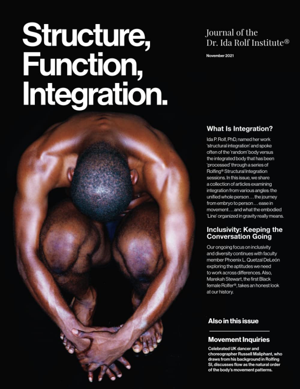 The November 2021 edition of Structure, Function, Integration has authors answering the “What Is Integration?” Ida P. Rolf, PhD, taught that the human body has an intrinsic organic wholeness, that doing manual interventions and offering movement education can facilitate the body’s organization in gravity. When a body stands, breathes, and moves as an integrated whole, we see the intrinsic grace of lift as well as grounding through the feet around what Rolf termed the ‘Line’. Our authors in this issue each have a unique way of describing this foundational knowledge of Rolfing® Structural Integration. From legacy faculty member Jan H. Sultan discussing the Principles of Intervention, to an inquiry into the ‘random body’, to musings on the ‘Line’, we see many approaches to the discussion of integration. Also in this issue we continue our diversity and inclusion theme by interviewing Marekah Stewart, the first female Black Rolfer®, and by looking at how personal social positioning and cultural competence affect the therapeutic alliance. We also draw your attention to our interview with award-winning choreographer Russell Maliphant, who incorporated studies in Rolfing SI into the body of somatic understanding he works from. This, and more, will be found in our November 2021 issue.The November 2021 edition of Structure, Function, Integration has authors answering the “What Is Integration?” Ida P. Rolf, PhD, taught that the human body has an intrinsic organic wholeness, that doing manual interventions and offering movement education can facilitate the body’s organization in gravity. When a body stands, breathes, and moves as an integrated whole, we see the intrinsic grace of lift as well as grounding through the feet around what Rolf termed the ‘Line’. Our authors in this issue each have a unique way of describing this foundational knowledge of Rolfing® Structural Integration. From legacy faculty member Jan H. Sultan discussing the Principles of Intervention, to an inquiry into the ‘random body’, to musings on the ‘Line’, we see many approaches to the discussion of integration. Also in this issue we continue our diversity and inclusion theme by interviewing Marekah Stewart, the first female Black Rolfer®, and by looking at how personal social positioning and cultural competence affect the therapeutic alliance. We also draw your attention to our interview with award-winning choreographer Russell Maliphant, who incorporated studies in Rolfing SI into the body of somatic understanding he works from. This, and more, will be found in our November 2021 issue.
