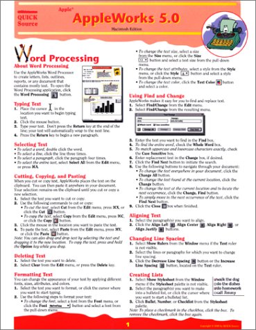 This 6 page, tri-fold full color guide is an invaluable resource for anyone who uses AppleWorks 5.0. It provides step- by- step instructions on how to utilize the various software programs. The word processor section explains how to type, select, cut, copy, paste, delete, format, and align text. The spreadsheet section shows how select cells; navigate between cells; enter, cut, copy, and paste data; insert rows and columns; sort; format text, and create charts. The database section teaches how define fields; use, delete, find, and sort records; create reports; and produce mailing labels. There are also sections on how to draw objects, use the paint feature, create slide shows, and much more! An excellent instructional tool for a user new to ApplwWorks5.0, it also serves as a handy reference tool for the more experienced user.