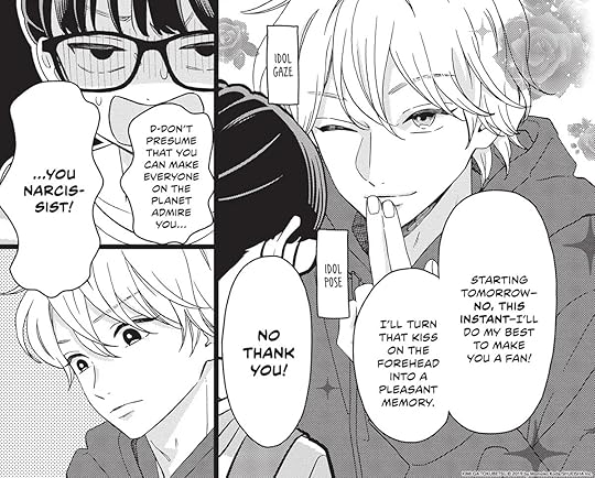 This is a romance manga that's in a hurry. Sure, it's obvious that the grumpy main character is going to eventually change her mind about romance and fall in love with the sunny pop idol, but did it have to happen halfway through the first volume? She goes from wishing baldness on every attractive guy in the world at the beginning of the book to a heartfelt declaration of love at the end, and this is not a long volume. Aside from feeling rushed, both of the main characters left a bad taste in my mouth. She's not just cynical about love, she's downright meanspirited. He's not just sunny, he has a nearly pathological need to be liked. They both come across as dangerously unstable, and it's very shaky ground for any kind of romance.