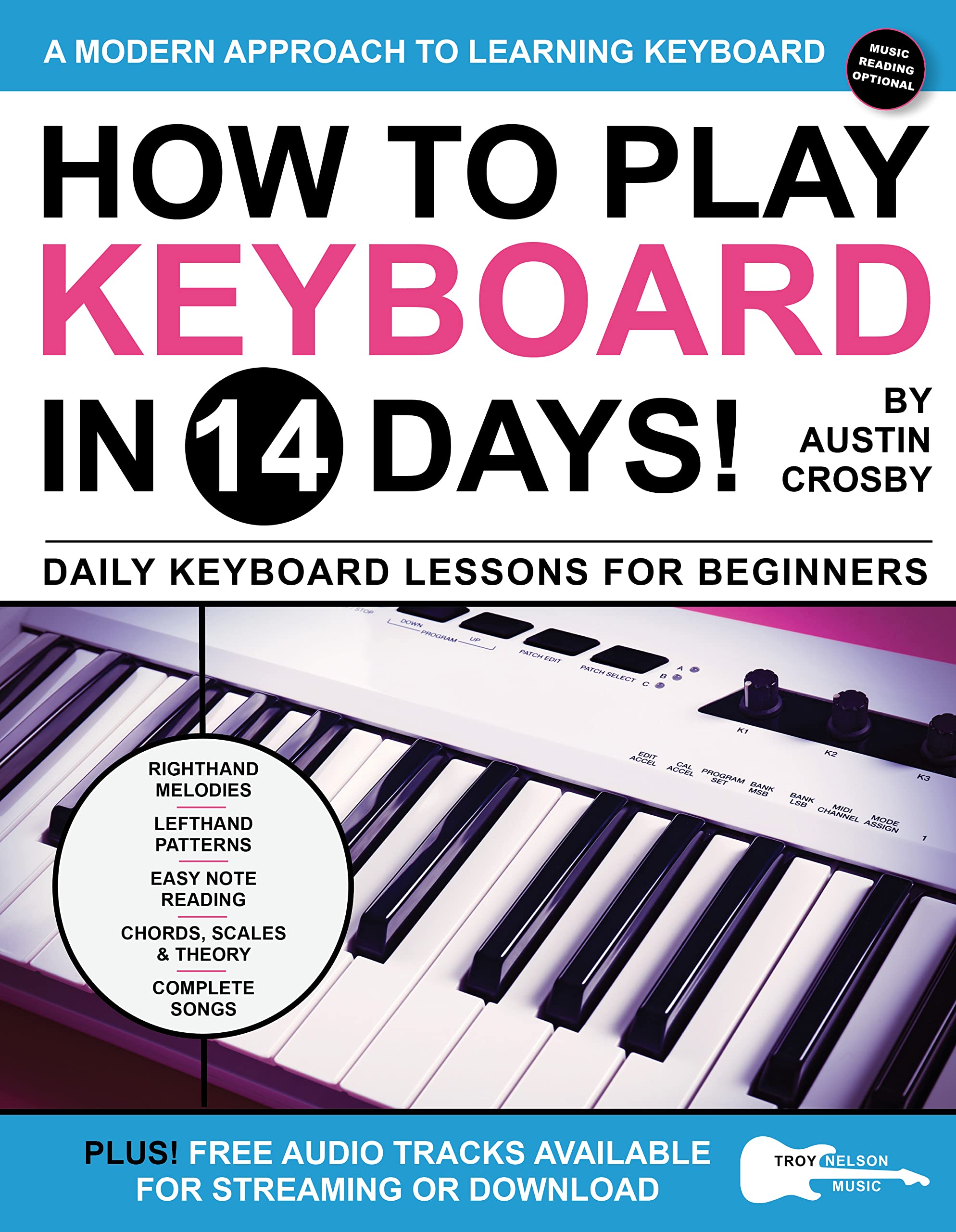 This keyboard book is jam-packed with fundamental keyboard sheet music and exercises so you can learn to play keyboard fast! Plus, it introduces a revolutionary new KEYBOARD TAB to make sight-reading keyboard sheet music and chords even easier! From the publisher of dozens of top-selling music lesson books, How to Play Keyboard in 14 Days from Troy Nelson Music takes a novel approach to keyboard music education that will have you playing great-sounding keyboard and piano sheet music in no time! How to Play Keyboard in 14 Days is a brand-new method for learning the keyboard. Have you struggled to learn keyboard because of the “old” way it’s taught? We’ve taken the concept of learning keyboard and made it easier than ever! How to Play Keyboard in 14 Days is a modern approach to keyboard music education. This easy-to-use beginner keyboard method is not designed to be an exhaustive be-all/end-all resource for keyboard; instead, this book’s intention is to jumpstart your keyboard playing so you can learn keyboard quickly. You don’t have to know how to read music to use this book! Why? Because of our KEYBOARD TAB . With this book, you'll be able to quickly identify the relationships between notes and keys! This keyboard book for kids and adult beginners alike will help you learn the keyboard quickly! Music examples are presented in notes and tab. This practical, step-by-step keyboard guide includes quick-and-easy access to audio tracks via download or streaming—right from troynelsonmusic.com. No signup required! From the top-selling series Play Music in 14 Days by Troy Nelson Music. Publisher and author Troy Nelson has sold more than 350,000 books and has 1,000s of reviews. You will see our books average 4.5 stars or more! About Austin Author of the #1 bestseller How to Play Piano in 14 Days, Austin Crosby has been a piano and keyboard player for over 20 years and has spent the past six years training young musicians in both individual and group settings. Austin has served as a worship leader at various camps, conferences, and churches, and this experience, combined with his classical background on piano, has led him to develop a novel, modern approach to teaching piano and keyboard. Austin understands what most new musicians are looking for these a fun and easy approach to playing music—fast! Free access to instant audio downloads from Troy Nelson Music’s website is included. Includes customer support! Questions during practice? Email us from our website and we'll happily help you.