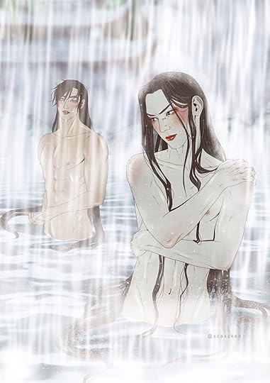 This person was very tall, quite a bit taller than Chu Wanning [...] His shoulders were strong and broad, and the shoulder blades that flexed beneath his golden skin hinted at a concealed strenght with each lift of his arms. The water cascaded over his body, rivulets gathering into streams to flow down the wide expanse of his powerfull, masculine back. [...]