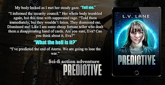 Predictive by Liv Lane. I can tell when someone is lying. And I know when they speak the truth. I predict about the future, about our civilization, And I've predicted that we are going to lose the war. I'm not afraid to use predictive skills to break the rules--to break people--if it's necessary for the greater good. My relationship with my brother may be strained, but he's in trouble, And I'm going to get him out...whatever it takes. A very enjoyable read. I liked the story. I liked Landon and Eva and how they were together. 4*.