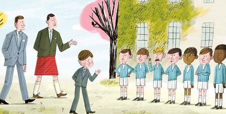 He was sent to boarding school in Scotland when he was eight to make him more independent. Note the tentative wave to the scowling boys. “… a boarding school where the future king could rub shoulders with other boys. Far from home, Charles felt quite alone.”