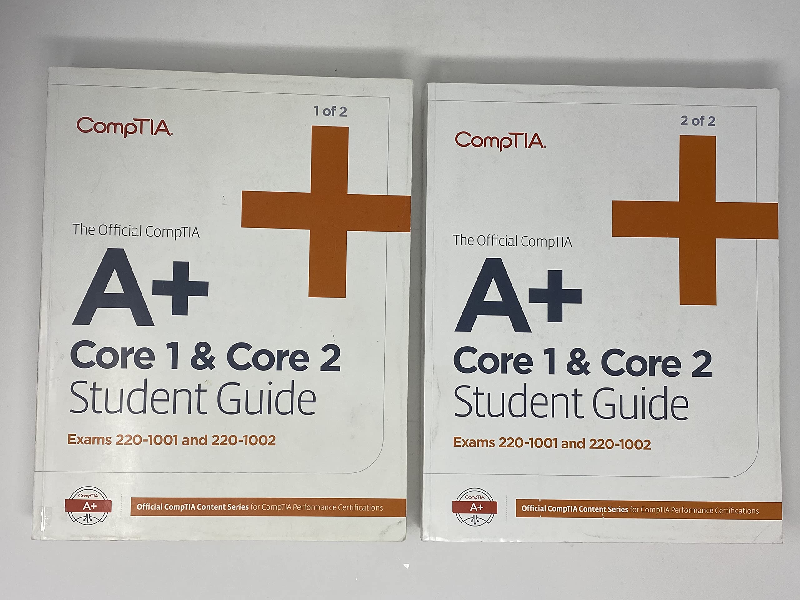 The Official CompTIA A+ Core 1 and Core 2 Self-Paced Study Guides (Exams 220-1001 and 220-1002) Set What’s included The Official CompTIA A+ Core 1 and Core 2 Student Guide (Exams 220-1001 and 220-1002)(Volume 1) The Official CompTIA A+ Core 1 and Core 2 Student Guide (Exams 220-1001 and 220-1002)(Volume 2) Designed for self-paced learners, two fully illustrated books cover all the latest A+ Core 1 (220-1001) and Core 2 (220-1002) exam objectives and are packed with informative and accessible content. Include the Content aligned to work in the real world - Lessons refer to functional areas within the job role while Topics relate to discrete job tasks Comprehensive glossary with important terms and acronyms What you’ll learn The Official CompTIA A+ Study Guides have been developed by CompTIA for the CompTIA certification candidate. Rigorously evaluated by third party subject matter experts to validate adequate coverage of the exam objectives, the Official CompTIA A+ Study Guides teach the essential skills and information required for the CompTIA certification exams (220-1001 and 220-1002). After reading the study guides you will understand how Install and configure PC system unit components and peripheral devices. Install, configure, and troubleshoot display and multimedia devices. Install, configure, and troubleshoot storage devices. Install, configure, and troubleshoot internal system components. Explain network infrastructure concepts. Configure and troubleshoot network connections. Implement client virtualization. Support and troubleshoot laptops. Support and troubleshoot mobile devices. Support and troubleshoot print devices. Support operating systems. Install, configure, and maintain operating systems. Maintain and troubleshoot Microsoft Windows. Configure and troubleshoot network connections. Manage users, workstations, and shared resources. Implement physical security. Secure workstations and data. Troubleshoot workstation security issues.